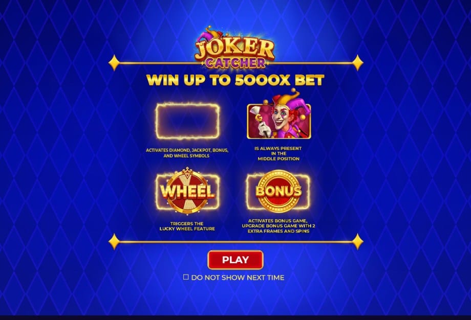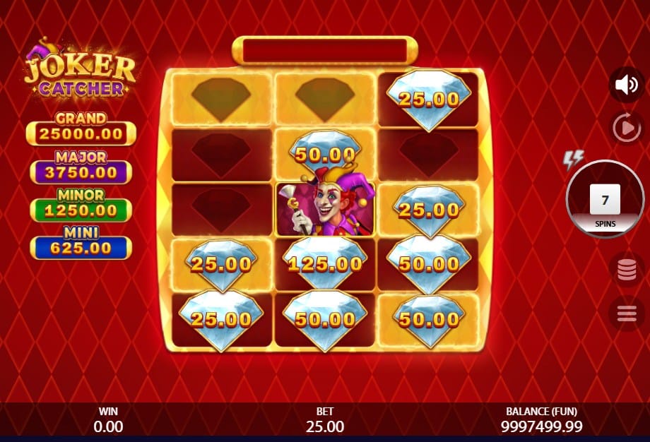 De Joker zit vastgelijmd in het hart van het speelveld (middenpositie) en fungeert als wild. Alleen: de echte actie zit niet in de lijnwinstjes, maar in de elektrische “frames” die telkens op verschillende vakjes oplichten. In de basisgame zie je er meestal vier of vijf per spin. Speciale symbolen zoals diamanten, jackpots en bonussymbolen doen pas iets als ze ín zo’n Catch Frame landen. Ligt die diamant net buiten het randje? Dan voelt het alsof je ‘m door de vingers ziet glippen.