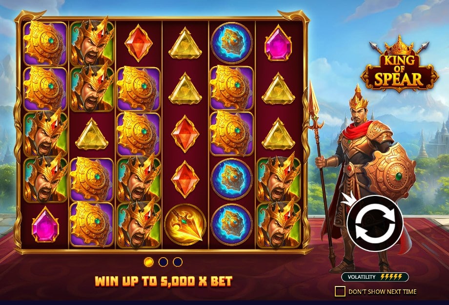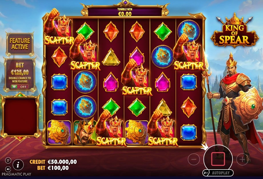 In King of Spear demo stap je een stenen arena in waar alles draait om tempo: winnen, wegvallen, nieuwe symbolen erin, en hopen dat er precies op het juiste moment een multiplier blijft plakken. Deze gokkast van Pragmatic Play speelt op een 6×5 grid met Scatter Pays. Geen vaste winlijnen dus; je pakt een prijs zodra er 8 of meer dezelfde symbolen ergens op het scherm landen.