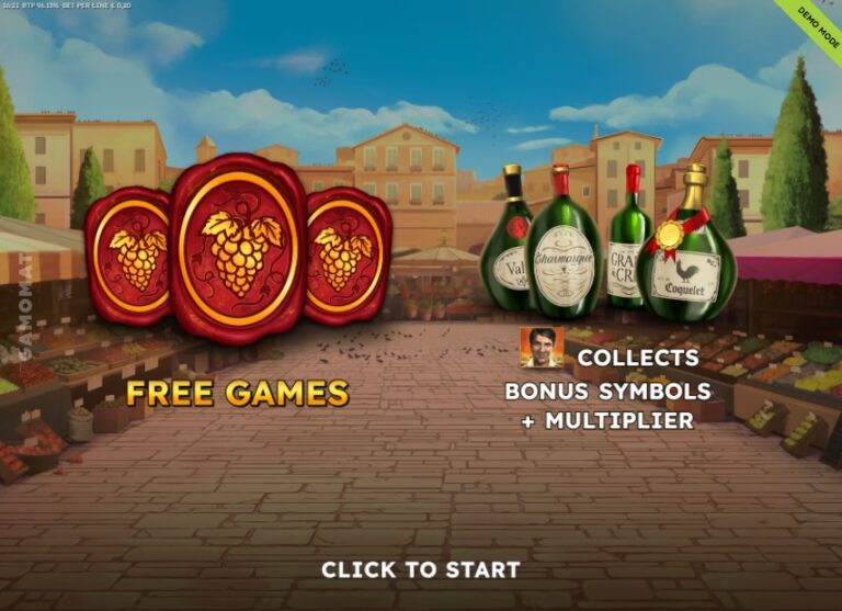 Het spel speelt zich af op een klassiek 5×3 raster met 10 vaste winlijnen, te midden van een levendige markt. De symbolen, van brood en kaas tot de trouwe hond van de wijnboer, dragen bij aan de idyllische sfeer. De basisgame is, zoals gebruikelijk in dit genre, een relatief rustige opmaat naar de bonusronde. Er zijn geen complexe features; de volledige focus ligt op het landen van de drie of meer scatters die de poort openen naar de wijnkelder. De standaard RTP is een prima 96,03% (kan variëren), en de medium volatiliteit zorgt voor een gebalanceerde speelervaring met regelmatige, kleinere winsten.