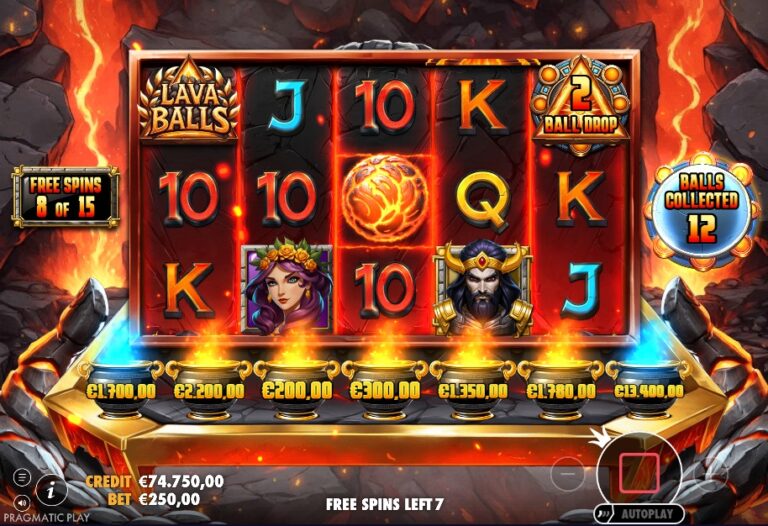 Wanneer je de free spins-ronde activeert (via scatters of de Plinko-drop), verandert de gameplay volledig. De 12 gratis spins zijn een voorbereidings- en verzamelfase. De potten onder de rollen bevatten nu directe geldprijzen, die je kunt verhogen door speciale symbolen te landen. Het hoofddoel is echter om speciale ‘Lava Ball’- en ‘Ball Drop’-symbolen te verzamelen. Deze voegen ballen toe aan een meter, tot een maximum van 100. De climax volgt pas aan het einde van de free spins. Alle door jou verzamelde lavaballen worden dan achter elkaar losgelaten op het Plinko-bord en vallen in de potten. De totale waarde van alle potten waar je ballen in landen, vormt je uiteindelijke, totale winst.
