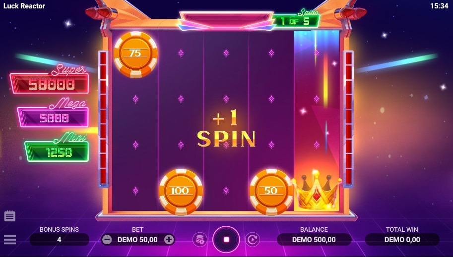 - Crown Spins: Je krijgt 3, 4 of 5 ‘Hold & Win’-stijl respins. Het veld bevat nu alleen nog munten en kronen. Het doel is om de jackpots (Mini, Mega, of de Super Jackpot van 1.000x) te landen. Een kroon op rol 1 geeft een multiplier; een kroon op rol 5 geeft een extra spin.