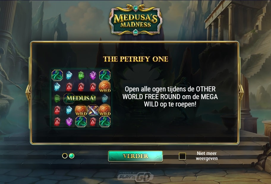 De ware climax van het spel is de ‘Other World Free Round’. Dit is geen traditionele free spins-ronde, maar één enkele, epische gratis ronde die je activeert door de ‘Stone Gateway’-meter met 42 symbolen te vullen. Je start deze ronde met 3 tot 7 willekeurige ‘Stone Gateway Effects’ (zoals ‘Special Wilds’ of ‘Gaze’) die direct worden toegepast. Het speelveld wordt ook gevuld met 11 tot 12 ‘Eye Marks’. Als je erin slaagt om op al deze gemarkeerde posities een winst te vormen, wordt de ‘Mega Wild Medusa’s Head’ ontgrendeld. Dit is een gigantische wild die over het scherm naar beneden beweegt voor een spectaculaire finale.
