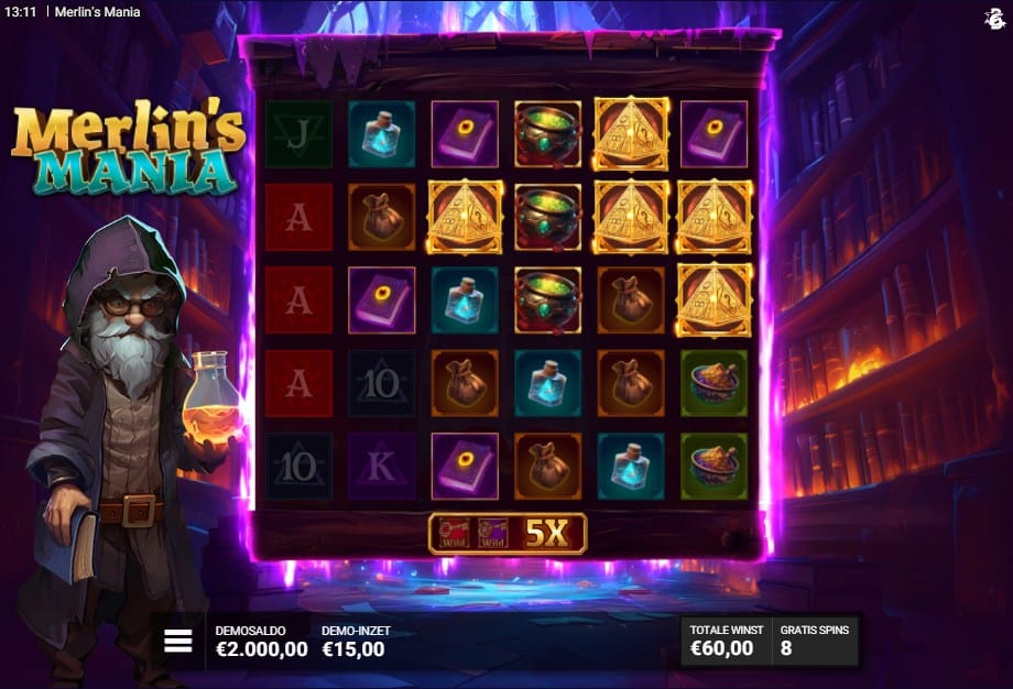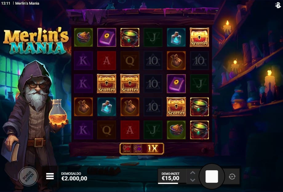 Merlijn de tovenaar is een graag geziene gast in de wereld van online gokkasten. Bullshark Games (powered by Hacksaw) brengt hem terug voor een tweede ronde in de Merlin’s Mania demo. Waar we hem in het vorige deel nog als alchemist zagen, heeft hij nu zijn kap opgezet en duikt hij dieper de duistere magie in. De setting is een sfeervolle kamer vol kaarsen en toverboeken, wat een mysterieuze vibe geeft die perfect past bij het thema. Het spelmechanisme leunt zwaar op scatter pays en mystery symbolen, een combinatie die we steeds vaker zien bij moderne grid-slots zoals Gates of Olympus 1000, maar dan met een unieke Bullshark-twist.