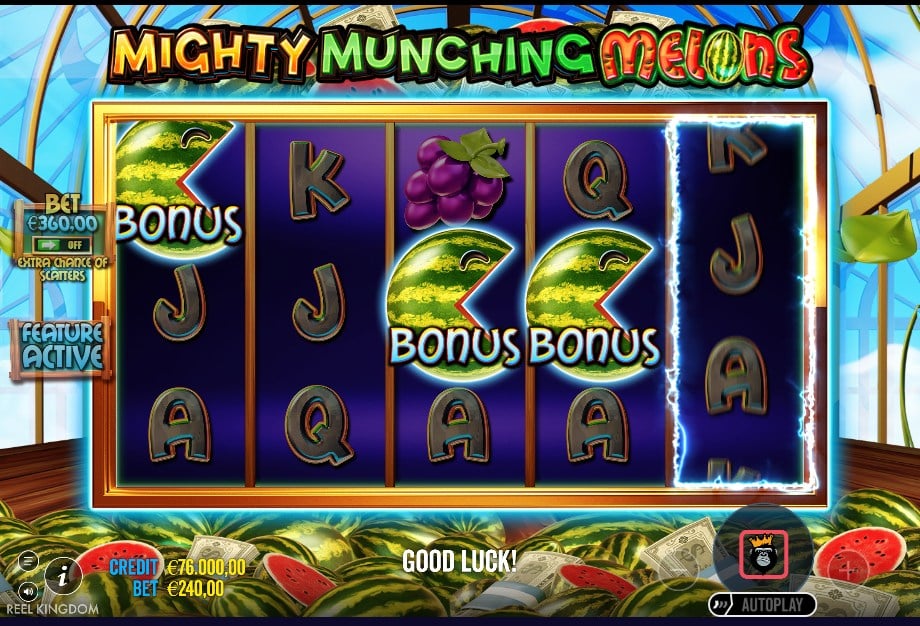 De Bonus Game start zodra je 3 of meer Bonus-scatters (watermeloen) landt. Je krijgt dan respins (meestal 3) op een leeggeveegd veld waar alleen lege vakjes, Money-symbolen en speciale meloenen kunnen verschijnen. Money-symbolen blijven vaststaan en resetten de respins, zoals je kent uit veel hold & win-games. Alleen zijn de waarden hier lekker breed: van 0,1x tot 500x je inzet.