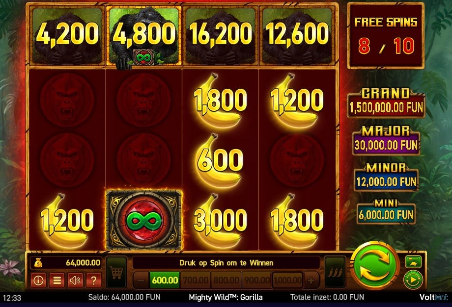 - Free Spins: Collectors sparen alles op en pas aan het einde wordt de totale buit uitbetaald. Tijdens deze ronde kunnen modifiers vallen, zoals een multiplier, een +3 op de countdown of zelfs een “infinity”-boost waardoor je Collector de hele bonus actief blijft. Ook retriggeren kan, wat de Mighty Wild Gorilla demo ineens van traag naar turbulent kan trekken.