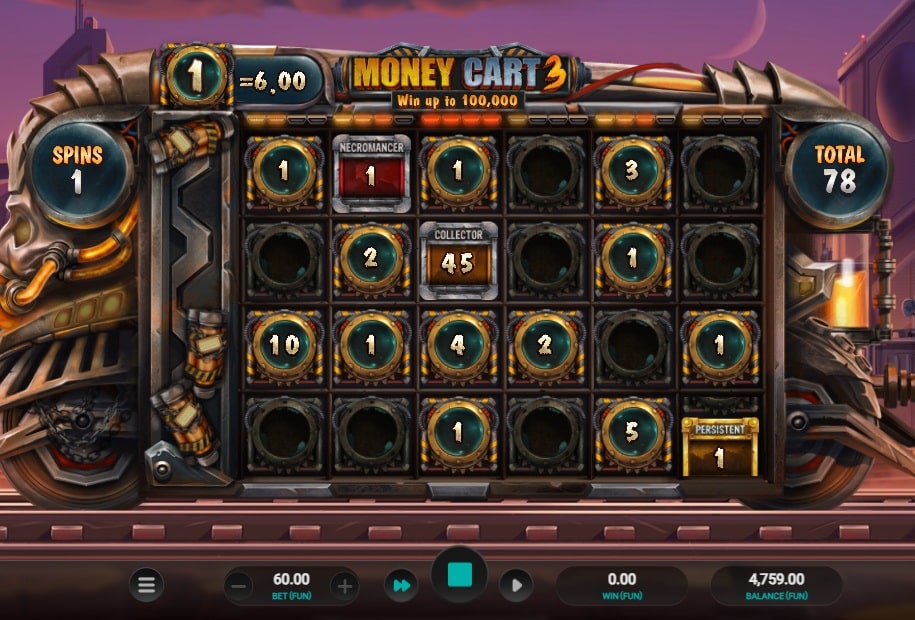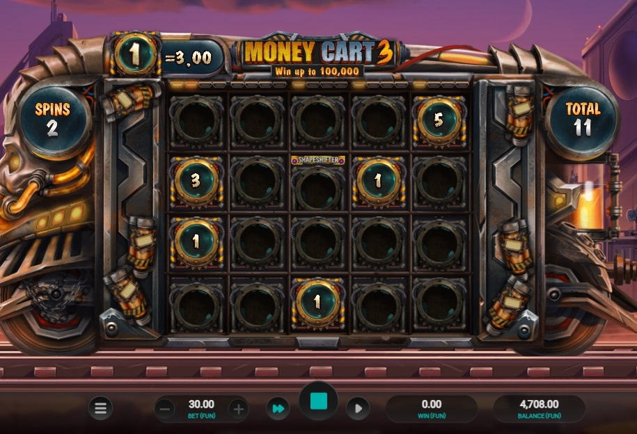 Als je de gokkast opent zie je het bekende 5×4 raster met lege plekken. Er zijn geen winlijnen, geen fruitsymbolen en geen kaartsymbolen. Het enige doel is het landen van drie of meer bonussymbolen. Omdat het spel hier volledig op is ingericht gebeurt dit veel vaker dan bij de ‘grote broer’ Money Train 3. Zodra je drie symbolen landt start de actie direct. Dit maakt Money Cart 3 ideaal voor spelers die geen geduld hebben of die een casino bonus snel willen rondspelen met veel actiemomenten. De RTP is met 96% solide en de variantie is hoog, al voelt het minder ‘alles-of-niets’ omdat je constant in de feature zit.