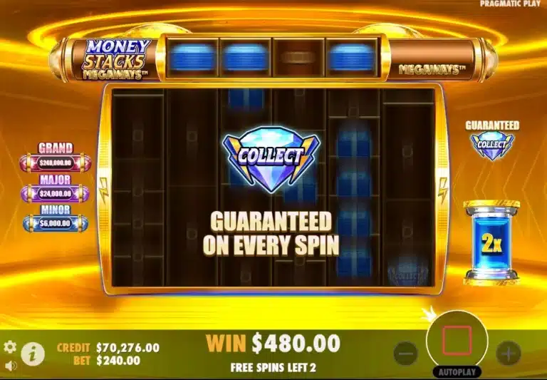 Met een RTP van 96,52% en een indrukwekkende hitfrequentie van 48,08% combineert Money Stacks Megaways regelmatige uitbetalingen met spannende pieken. Super Collect-symbolen voegen extra Money-symbolen toe, terwijl vermenigvuldigers tot x10 in het basisspel de spanning verhogen.