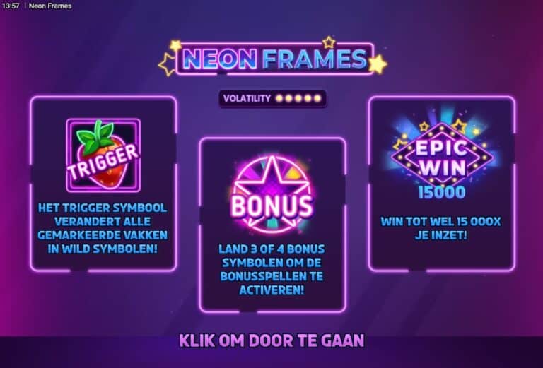 Bereid je voor op een visueel spektakel van fruit en neonlichten in Neon Frames, een nieuwe en energieke grid slot van Backseat Gaming. Op het eerste gezicht lijkt dit een simpele, futuristische fruitautomaat, maar onder de glanzende oppervlakte schuilt een briljante en zeer volatiele mechaniek. De gameplay is een meesterwerk van opbouwende spanning, volledig gericht op de gelijknamige ‘Neon Frames’-feature. Elke keer dat een Wild-symbool landt, laat het een ‘sticky’ kader achter op het speelveld. Deze kaders bouwen multipliers op en wachten op één cruciaal symbool: de ‘Trigger’-aardbei. Wanneer deze landt, verandert elk kader op het scherm in een Wild, wat kan leiden tot een explosieve kettingreactie. Met een maximale winst van 15.000x de inzet is dit een spel dat geduld beloont met een lichtshow van jewelste.