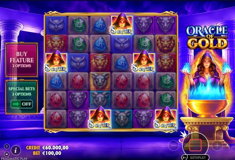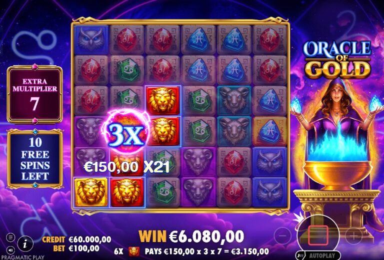 Het orakel spreekt op een groot 6×6 raster met de ‘Cluster Pays’-mechaniek. Elke winnende cluster activeert de Tumble-feature, waarbij winnende symbolen verdwijnen en plaatsmaken voor nieuwe. De ware magie van de basisgame zit in de ‘Extra Multiplier Feature’. Willekeurige symbolen kunnen landen met een gouden achtergrond. Wanneer zo’n gouden symbool deel uitmaakt van een winst en explodeert, laat het een Wild-symbool achter op zijn plek. Deze nieuwe wild kan een x2 of x3 multiplier hebben. De echte kracht wordt ontketend wanneer meerdere van deze wilds in dezelfde cluster zitten: hun waardes worden dan met elkaar vermenigvuldigd. Een winst met een x2 en een x3 wild krijgt dus een totale multiplier van x6. De RTP is, zoals we gewend zijn bij slots van Pragmatic, rond de 94.50% bij de meeste Nederlandse online casino’s.