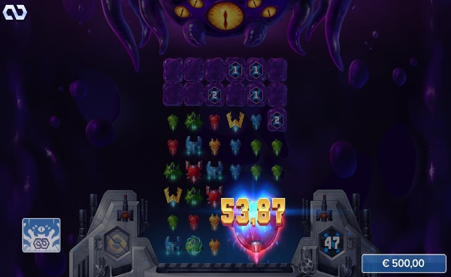 Naast de ‘Level Progression’ kent het spel ook een free spins-ronde, die je op unieke wijze activeert: een ‘Bonus’-symbool (een raket) moet door de cascades de bovenste rij van het scherm bereiken. Je krijgt dan 5 ‘free drops’ (gratis spins) waarin alle basisgame-mechanics actief zijn. Eerlijk gezegd voelt de ‘Final Level’-feature in de basisgame spannender en innovatiever aan dan deze standaard bonus ronde.