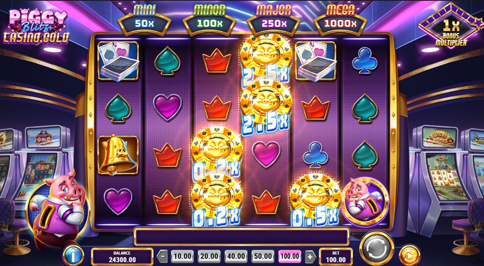 Het spel speelt zich af op een 6×4 raster met 4.096 manieren om te winnen. De symbolen zijn klassieke casino-iconen (chips, kaarten, dobbelstenen). De basisgame kent twee belangrijke ‘collect’-mechanics. Ten eerste is er de ‘Cash Coins’-feature: munten (met waardes tot 25x of jackpots tot 1.000x) worden geïnd door ‘Piggy Bank’-symbolen op de rollen 1 en 6. Ten tweede is er de ‘Piggy Collection’: munten die niet worden geïnd, vullen een spaarvarken naast de rollen, wat willekeurig een directe geldprijs tot 5.000x kan opleveren. Nieuw is de ‘Bonus Game Multiplier’-meter: elke keer dat je 2 scatters landt, vul je deze meter, wat de start-multiplier voor je toekomstige bonusronde permanent verhoogt (tot x5).