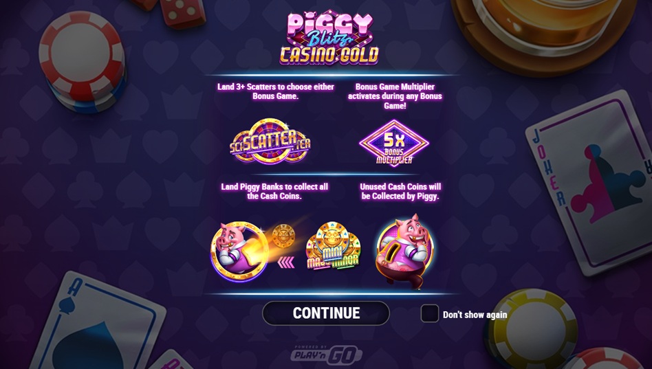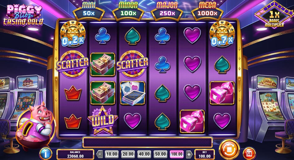 Het spel speelt zich af op een 6×4 raster met 4.096 manieren om te winnen. De symbolen zijn klassieke casino-iconen (chips, kaarten, dobbelstenen). De basisgame kent twee belangrijke ‘collect’-mechanics. Ten eerste is er de ‘Cash Coins’-feature: munten (met waardes tot 25x of jackpots tot 1.000x) worden geïnd door ‘Piggy Bank’-symbolen op de rollen 1 en 6. Ten tweede is er de ‘Piggy Collection’: munten die niet worden geïnd, vullen een spaarvarken naast de rollen, wat willekeurig een directe geldprijs tot 5.000x kan opleveren. Nieuw is de ‘Bonus Game Multiplier’-meter: elke keer dat je 2 scatters landt, vul je deze meter, wat de start-multiplier voor je toekomstige bonusronde permanent verhoogt (tot x5).