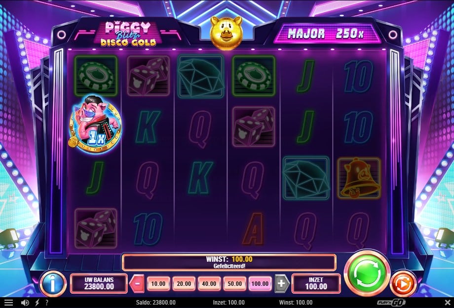 De lagere symbolen zijn de bekende 10 tot en met A. Die betalen vooral “oké” als je er veel van pakt (denk aan kleine, frequente tikken). De premium symbols zijn meer casino-achtig: chips, dobbelstenen, een bel en een diamant. Daar zit wat meer pit in, maar de basisuitbetalingen blijven bewust bescheiden. Logisch ook, want Piggy Blitz Disco Gold draait minder om klassieke lijnwins en meer om het binnenharken van munten en jackpots.
