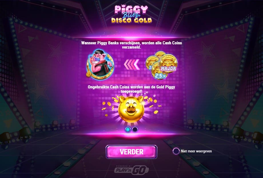 De Piggy Blitz Disco Gold demo is zo’n gokkast die je niet subtiel probeert te verleiden. Je staat meteen in een oververlichte nachtclub, met een DJ-booth als speelveld, een catwalk eronder en een soundtrack die klinkt alsof een jaren 80-actiefilm een discobal heeft opgegeten. Deze titel komt van Play’n GO en bouwt verder op het Coin & Collect-idee van de eerdere Piggy Blitz. Alleen is dit geen “nog een laagje verf”-sequel: je krijgt extra bonussen, meer keuzes en een hogere maximale winst tot 6.000x je inzet.