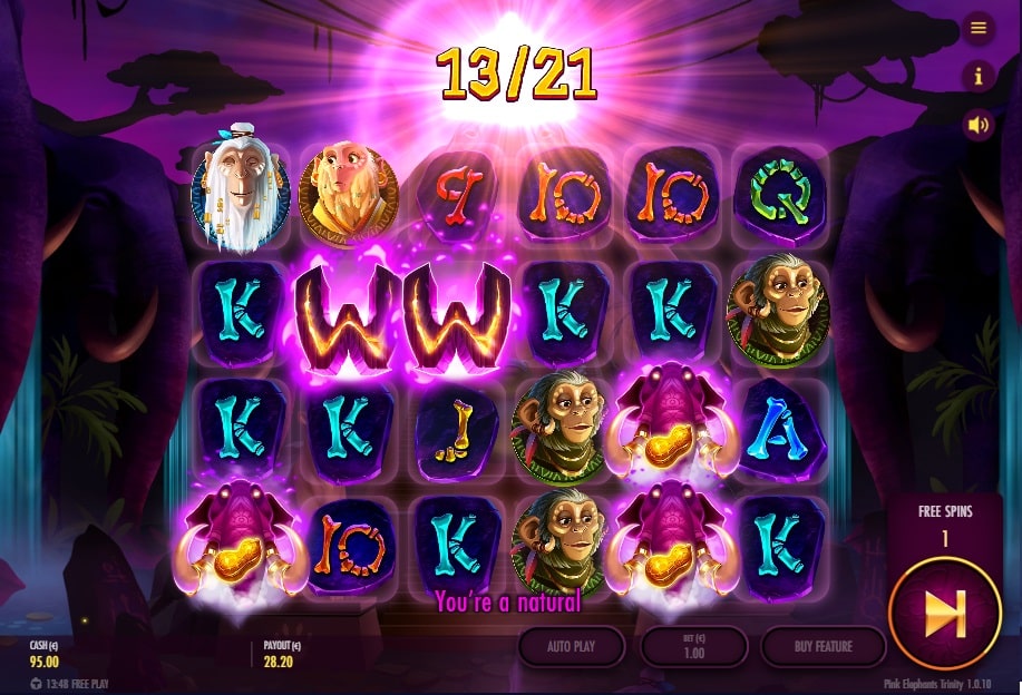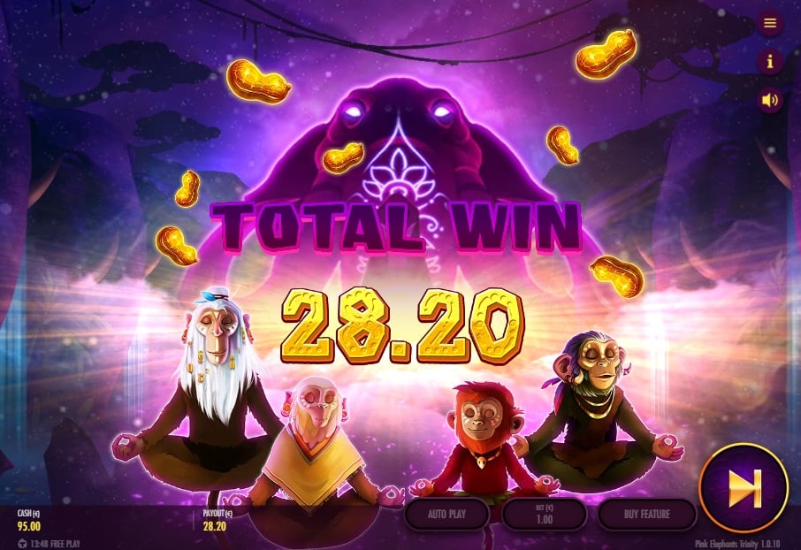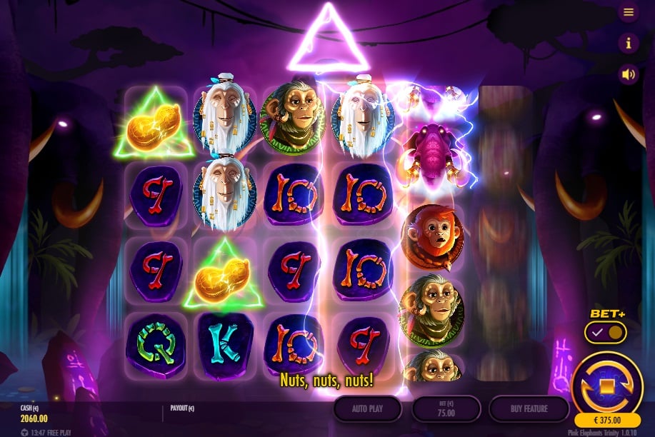 Wanneer je de bonusronde activeert met 3 of meer scatters, start je een expeditie in zes levels. Je verzamelt ‘Pinda’s’ van de olifant- en scatter-symbolen om te levelen. Elk nieuw level levert +3 extra spins op en ontgrendelt een nieuwe, krachtige feature: