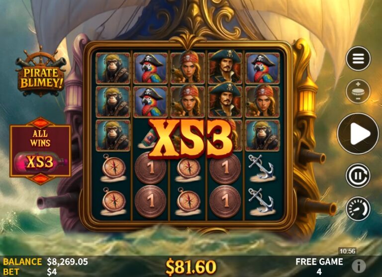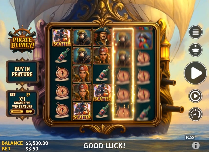 Naast de ‘Mystery & Nudge’-feature is er ook een meer traditionele free spins-ronde, genaamd de ‘Blimey Free Games’. Deze activeer je door 3, 4 of 5 ‘Pirate Ship’-scatters te landen. Een interessante regel is dat de scatters niet kunnen landen terwijl de ‘Mystery & Nudge’-feature actief is, waardoor de twee hoofdfeatures netjes van elkaar gescheiden blijven. De bonus biedt een geconcentreerde reeks van spins waarbij de kans op de ‘Mystery & Nudge’-feature waarschijnlijk is verhoogd.
