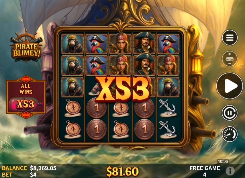 Naast de ‘Mystery & Nudge’-feature is er ook een meer traditionele free spins-ronde, genaamd de ‘Blimey Free Games’. Deze activeer je door 3, 4 of 5 ‘Pirate Ship’-scatters te landen. Een interessante regel is dat de scatters niet kunnen landen terwijl de ‘Mystery & Nudge’-feature actief is, waardoor de twee hoofdfeatures netjes van elkaar gescheiden blijven. De bonus biedt een geconcentreerde reeks van spins waarbij de kans op de ‘Mystery & Nudge’-feature waarschijnlijk is verhoogd.
