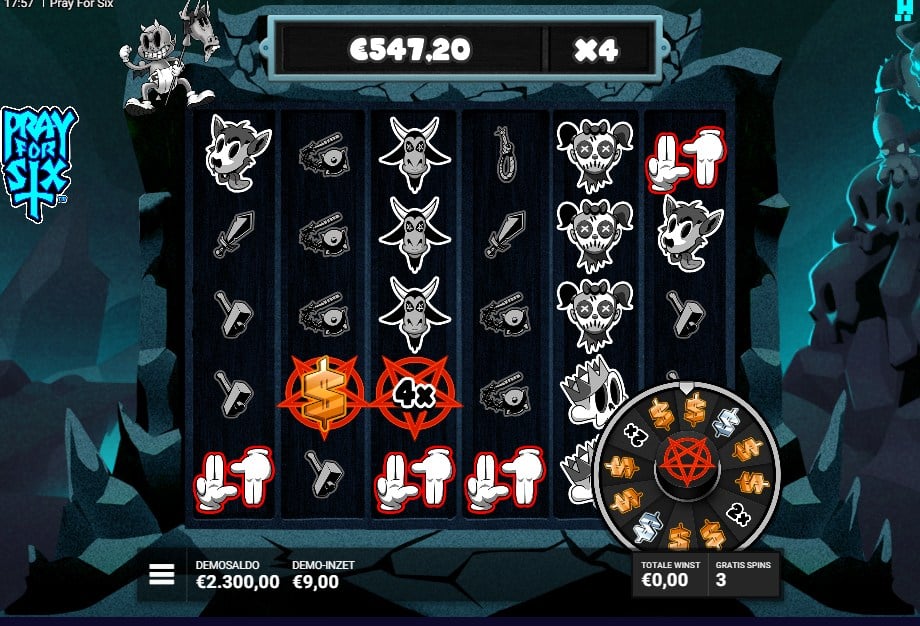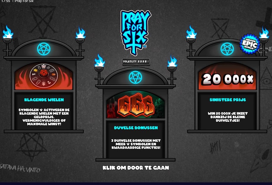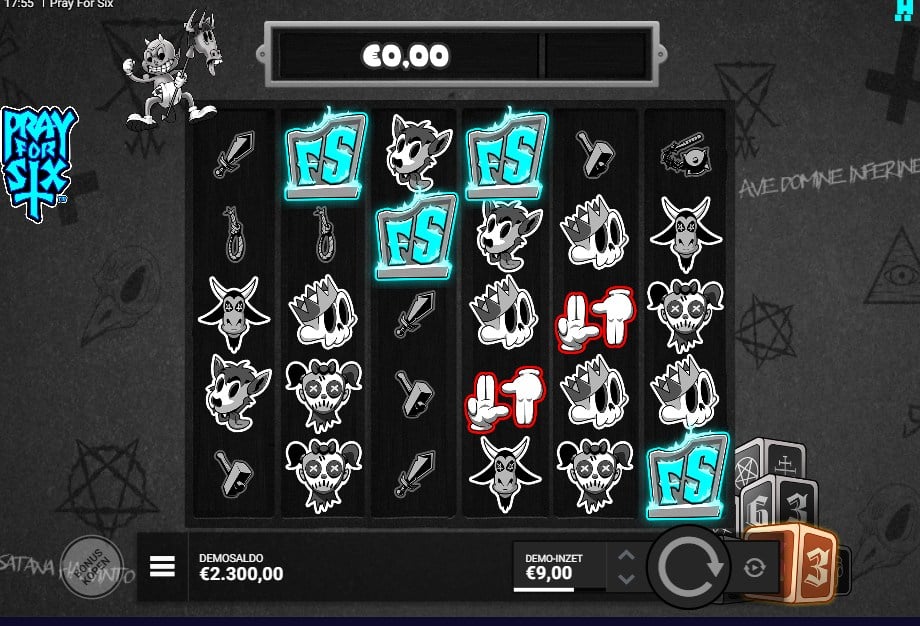 In de Pray for Six demo stap je een monochrome nachtmerrie in waar alles zwart-wit-grijs is, met af en toe een felle kleurvlek alsof iemand er expres met stift overheen is gegaan. Deze online gokkast is gemaakt door Hacksaw Gaming en voelt als een vreemde mix van jaren-40-cartoon en infernale strip: duivels, creepy speelgoedhoofden en overal van die dit gaat mis-vibes.