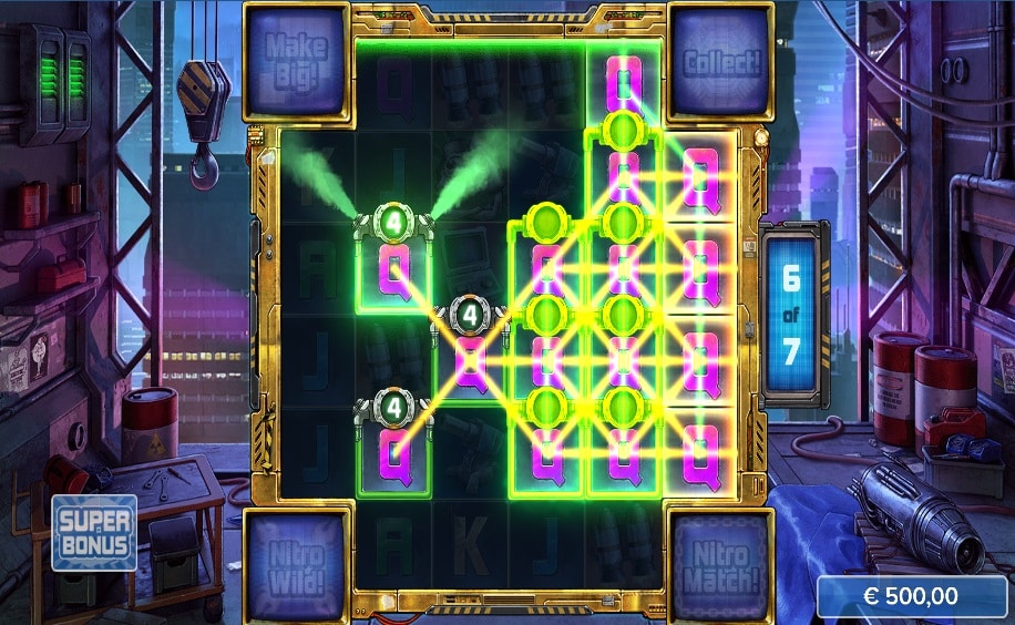 De chaos wordt verder opgevoerd door de bekende ‘Nitro Reels’. Deze speciale symbolen bevatten een stapel van identieke symbolen (tot 8 hoog) op één enkele positie, en worden gecreëerd op de kruispunten van winnende lijnen. Daarnaast kunnen de vier ‘Feature Screens’ in de hoeken willekeurig een van de vier modifiers activeren: ‘Make Big’ (creëert een megasymbool), ‘Collect’ (verzamelt alle munt-symbolen), ‘Nitro Wild’ (verandert Nitro Reels in wilds) en ‘Nitro Match’ (maakt alle Nitro Reels identiek).