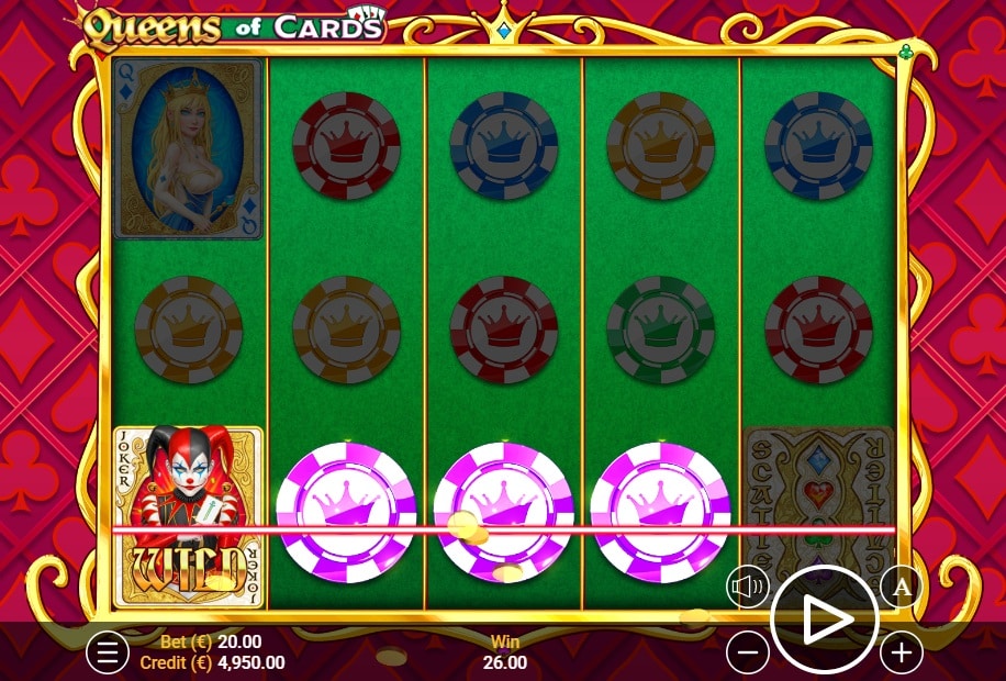 De Queens of Cards demo draait op een klassiek 5×3 raster met 20 vaste winlijnen. Inzetten is simpel: je kiest per spin een bedrag tussen 0,10 en 30 euro. De symbolen variëren van bekende harten, schoppen en ruiten tot vijf krachtige queens met ieder hun eigen persoonlijkheid. Win je? Dan worden de queens tot leven gewekt met subtiele animaties.