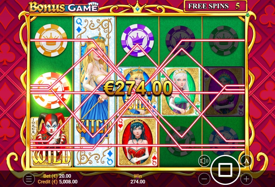De Scatter, een luxe kaart met alle vier suits, is jouw sleutel tot de Free Spins bonus. Draai drie Scatters op rollen 1, 3 en 5 en je krijgt direct 10 gratis spins. Voorafgaand aan deze ronde wordt één van de queens geselecteerd als Extra Wild. Tijdens de gratis spins worden er bij iedere draai twee tot vijf rollen gemarkeerd. Komt er een Wild of Extra Wild op zo’n rol? Dan vult hij de hele reel!