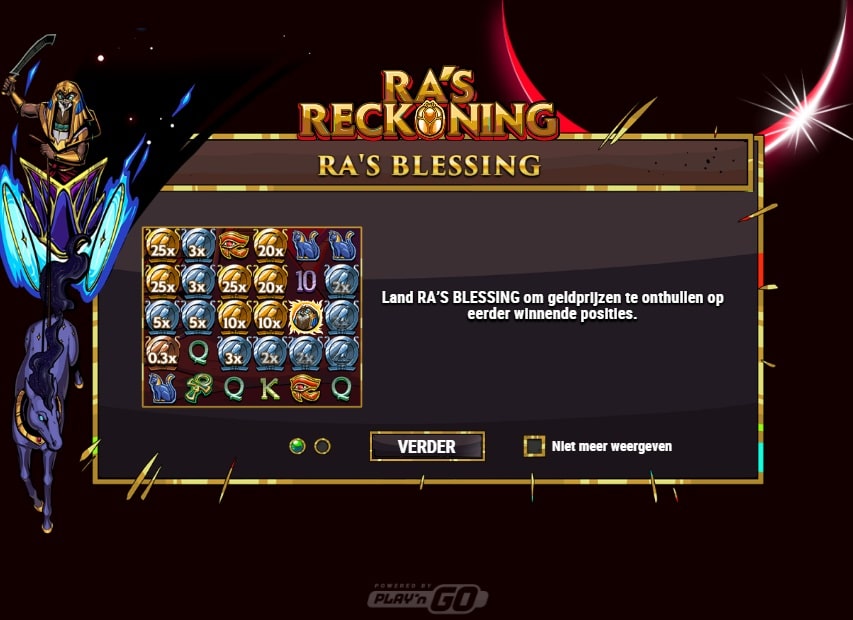 De ware uitbetaling en de enige bonusronde in het spel is Ra’s Blessing. Dit is geen free spins-ronde, maar een directe ‘payout’-feature die wordt geactiveerd door het speciale Ra-symbool. Wanneer dit symbool aan het einde van een spin-reeks op het scherm staat, gebeurt er iets magisch: alle ‘Divine Frames’ op het veld worden geactiveerd. De kaders veranderen in ‘Coin Symbols’ met directe geldprijzen, waarbij de waarde afhangt van de kleur van het kader (brons, zilver of goud). Gouden kaders kunnen prijzen tot wel 25x de inzet per stuk onthullen. De totale waarde van alle munten wordt vervolgens bij elkaar opgeteld en uitbetaald.