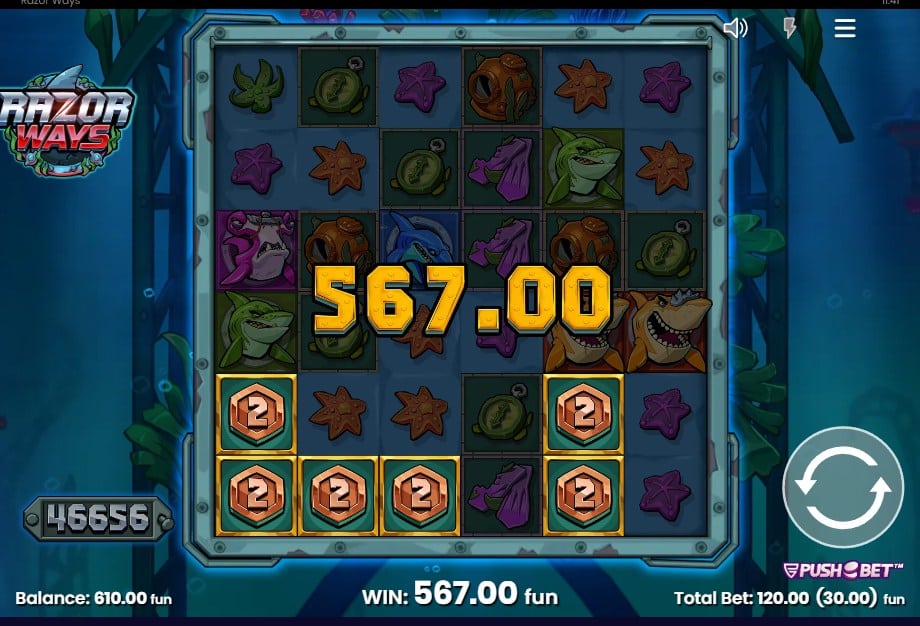 Het avontuur begint op een 6×3 raster met 729 manieren om te winnen, maar dit is slechts het begin. Boven het veld liggen drie extra rijen vergrendeld. Elke winnende combinatie activeert niet alleen een cascade (winnende symbolen verdwijnen), maar ontgrendelt ook één extra rij, waardoor het aantal winmanieren groeit tot een maximum van 46.656 (op een 6×6 veld). Dit ‘expanding rows’-systeem is de nieuwe motor van de basisgame. De bekende ‘Mystery’-symbolen (het zeewier) zijn er nog steeds, maar onthullen nu een willekeurig symbool, een ‘Expanding Wild’ (een octopus) of een ‘Converter into Wild’-symbool.