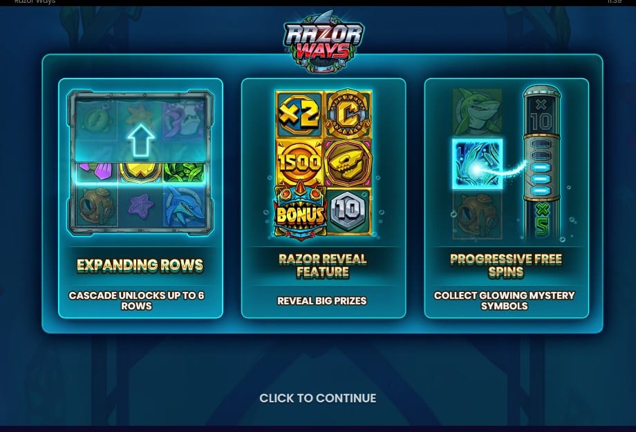 De ware vervanger van de ‘Nudge & Reveal’ is de ‘Razor Reveal Feature’. Deze wordt geactiveerd wanneer je ‘Mystery’-symbolen op 3 of meer aaneengesloten rollen landt (of willekeurig). Het speelveld verandert dan in een ‘hold-and-win’-stijl bonus waarbij de ‘Golden Shark’-symbolen spinnen om een van de volgende prijzen te onthullen: