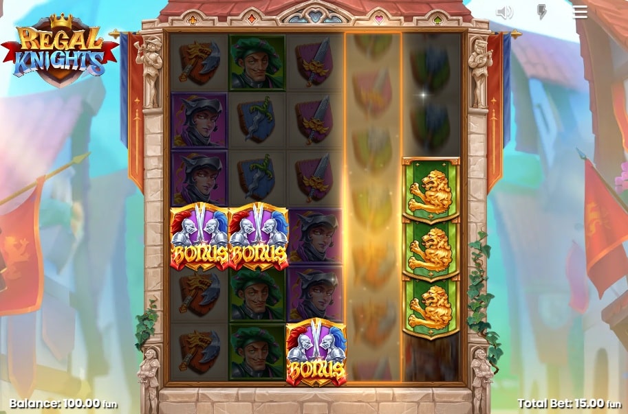 Wanneer we denken aan Push Gaming, denken we vaak aan meedogenloze gokkasten die je saldo in seconden kunnen verslinden of je in één klap rijk kunnen maken. Ze staan bekend om hun extreem hoge variantie. Met de Regal Knights demo gooit de studio het echter over een compleet andere boeg. We reizen af naar een middeleeuws koninkrijk, maar verwacht geen bloederige veldslagen of duistere kerkers. De sfeer is luchtig, bijna cartoonesk, met scheve huisjes en vrolijke ridders die eerder lijken op figuranten in een pretpark dan op oorlogsveteranen. Het is een duidelijke stijlbreuk met hun eerdere werk en dat maakt deze release des te interessanter.