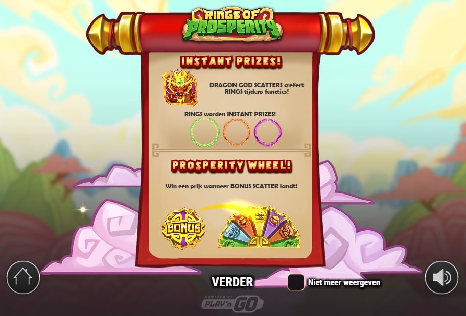 Het avontuur speelt zich af op een 5×3 raster met 243 manieren om te winnen, tegen een prachtige achtergrond van een Chinees berglandschap. De basisgame is een jacht op twee soorten scatters. Het ‘Bonus Scatter’-symbool, dat alleen op rol 3 landt, activeert het ‘Prosperity Wheel’. Dit prijzenwiel kan je een van de drie vaste jackpots (tot 100x) toekennen, of het activeert de ‘Pot Respins’-feature.