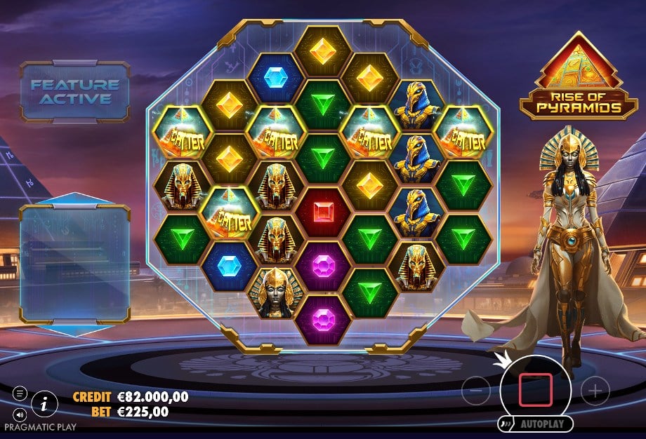 De Rise of Pyramids demo is zo’n slot waarbij je eerst denkt: “weer een piramide”, en je daarna ineens naar een soort Stargate-achtige poort staat te kijken. Deze gokkast van Pragmatic Play gooit het oude Egypte in een futuristisch jasje: neon, sterrenhemel, glimmende piramides en een speelveld dat niet netjes rechthoekig is, maar als een honingraat in de vorm 3-4-5-6-5-4-3.