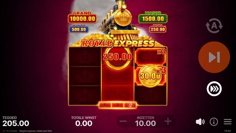 Wanneer je een ‘Bonus‘-symbool op rol 1 en 3 combineert met een ‘Boost’-symbool op rol 2, start de ‘Bonus Game’. Je krijgt 3 respins die resetten. Het ‘Boost’-symbool op de middelste rol wordt ‘sticky’ en verzamelt alle nieuwe munten die landen. De grote innovatie is de ‘Royal Express Multipliers’-feature. Willekeurig kan er een trein over het scherm rijden en multipliers (x2, x3) toekennen aan posities op de rollen 1 en 3. Deze multipliers tellen bij elkaar op en verhogen de waarde van alle munten die op die plek landen. Je jaagt ook op vier vaste jackpots, met de Grand Jackpot van 1.000x als hoofdprijs.