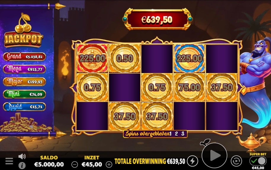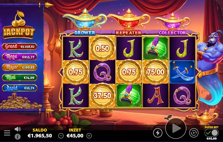 De Genie Bonus is dit de onbetwiste hoofdfeature van het spel. Het is de climax waar je de hele basisgame naartoe werkt. Het spel heeft geen traditionele free spins-ronde, wat de ‘Genie Bonus’ nog belangrijker maakt. Voor spelers die het lot een handje willen helpen, zijn er twee opties: de ‘Super Bet’, een ‘ante bet’ die de kans op het activeren van de bonus verhoogt, en een directe ‘Buy Bonus’-optie.