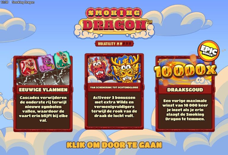 Stap in een wonderlijke, Aziatisch geïnspireerde tekenfilmwereld met Smoking Dragon, een sfeervolle gokkast van Hacksaw Gaming. In tegenstelling tot de vaak grimmige titels van deze ontwikkelaar, is dit spel vrolijk, kleurrijk en toegankelijk. We ontmoeten een vriendelijke draak die met zijn pijp rookwolken over de rollen blaast. Het spel onderscheidt zich door een relatief lage tot medium variantie (2 uit 5), wat ongebruikelijk is voor deze studio, maar behoudt wel een indrukwekkende maximale winst van 10.000x de inzet. De gameplay wordt gedreven door een unieke val-mechaniek en krachtige Wilds die zichzelf kunnen vermenigvuldigen.