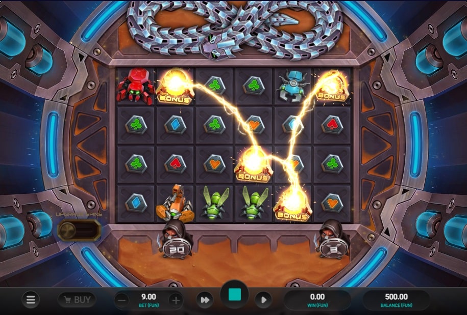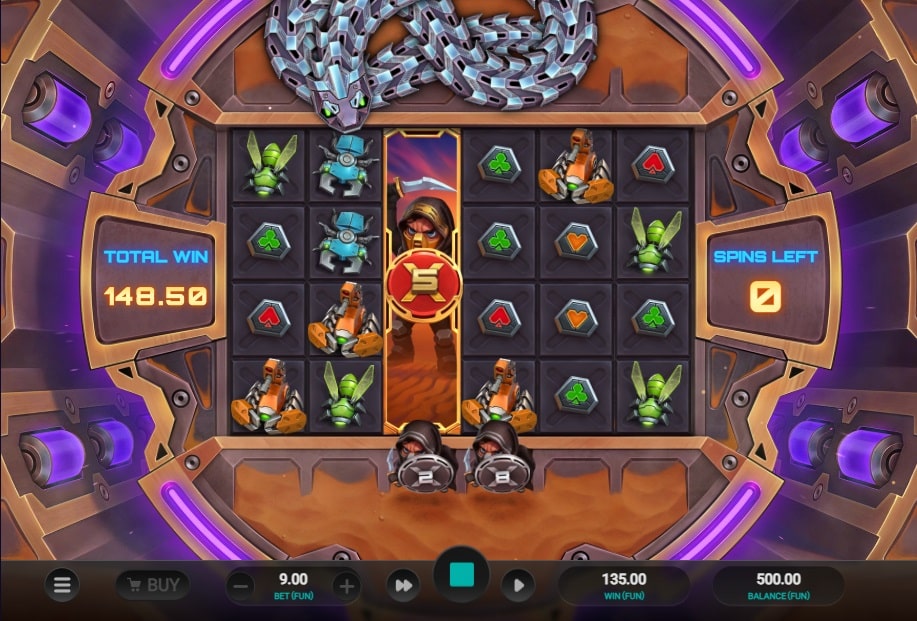 Het avontuur speelt zich af op een 6×4 raster met 14 vaste winlijnen. De sfeer is futuristisch en de symbolen zijn mechanische insecten. De basisgame wordt constant spannend gehouden door de Wild Chase-feature. Onder de rollen kunnen ‘Slayers’ (krijgers) verschijnen met multipliers tot wel x1.000. De mechanische slang boven de rollen kan willekeurig ‘ontwaken’ en een rol aanvallen. Als er een Slayer onder die rol staat, verandert de hele rol in een wild met de bijbehorende multiplier. Dit kan leiden tot een kettingreactie van aanvallen en meerdere ‘full reel wilds’ in één spin. De standaard RTP is een prima 96,1% (kan variëren).