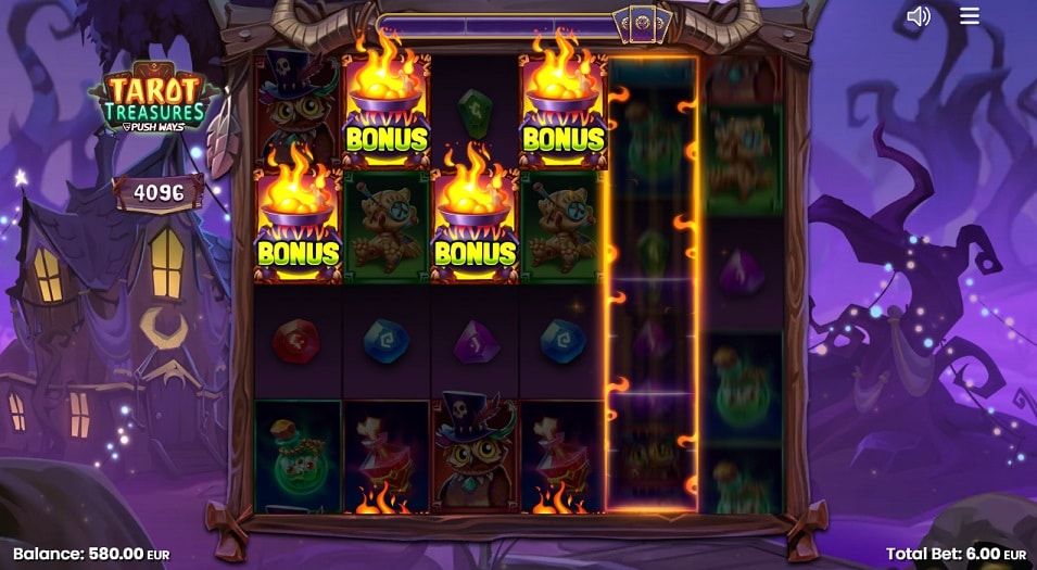 Wanneer je 3 of meer ‘ketel’-scatters landt, begint de ware seance met 8 of meer gratis spins. De bonusronde kent twee cruciale upgrades. Ten eerste start je direct met twee volledige rollen bedekt met ‘Hot Zones’. Ten tweede wordt de ‘Cascade Meter’ uitgebreid naar 5 segmenten en is deze persistent. Hij reset dus niet meer tussen de spins. Dit zorgt voor een constante stroom van Tarot-features. Bovendien zijn de features zelf ook krachtiger in de bonus, met bijvoorbeeld meer wilds en hogere multipliers (tot x100).