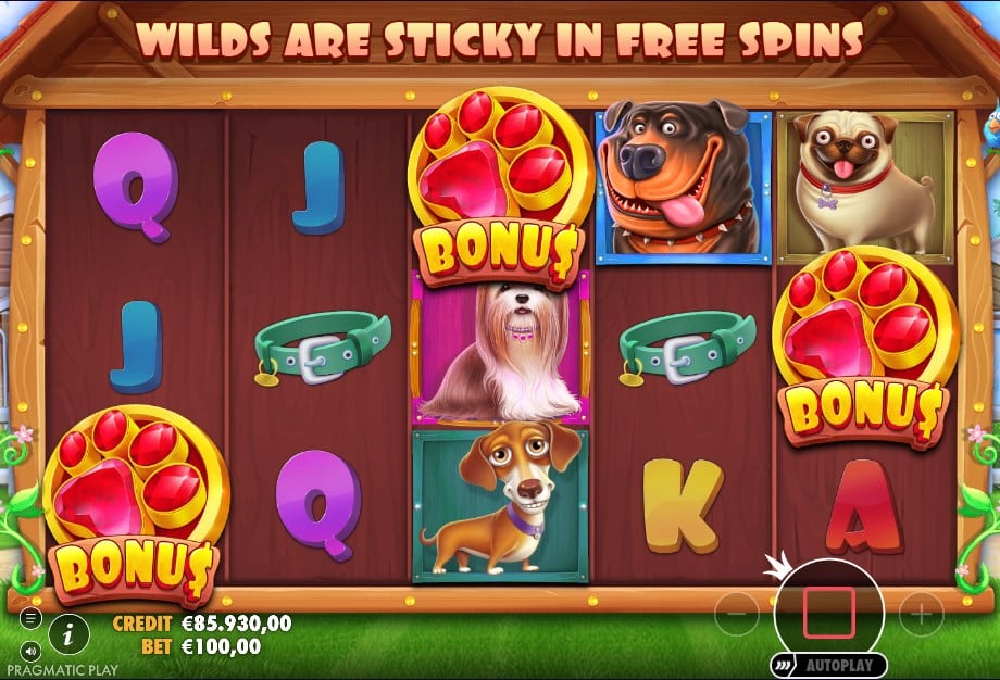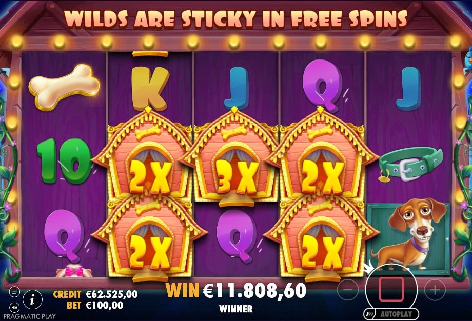 De ster van de show is het hondenhok (Wild). Die verschijnt alleen op de middelste rollen (2, 3 en 4) en krijgt bij elke spin een willekeurige multiplier van 2x of 3x. Komt zo’n wild in je winlijn terecht, dan tikt je uitbetaling direct omhoog. En als je meerdere multiplier wilds in dezelfde hit meepakt, kan die boost flink oplopen (denk aan de bekende “stapelen” van multipliers tot maximaal 9x op één lijn). In het basisspel is dat al lekker, maar je merkt vooral dat dit spel gebouwd is om in de bonus helemaal los te gaan.