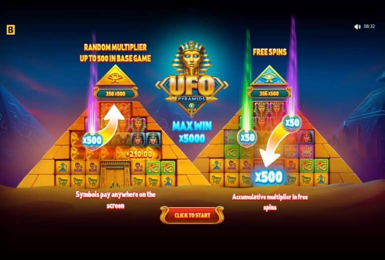 Zijn de piramides gebouwd door buitenaardse wezens? In UFO Pyramids, een kleurrijke en zeer volatiele gokkast van BGaming, is het antwoord een volmondig ‘ja’. Dit spel gooit het klassieke Egypte-thema in een sci-fi blender. Je speelt op een 6×5 raster met de ‘Scatter Pays’-mechaniek (winst bij 8+ symbolen waar dan ook). De gameplay draait om cascades (‘Refilling Reels’) en krachtige ‘Multiplier’-symbolen die kunnen oplopen tot een astronomische x500. In de free spins-ronde worden deze multipliers verzameld in een globale meter, wat kan leiden tot een maximale winst van 5.000x de inzet.