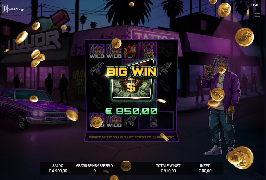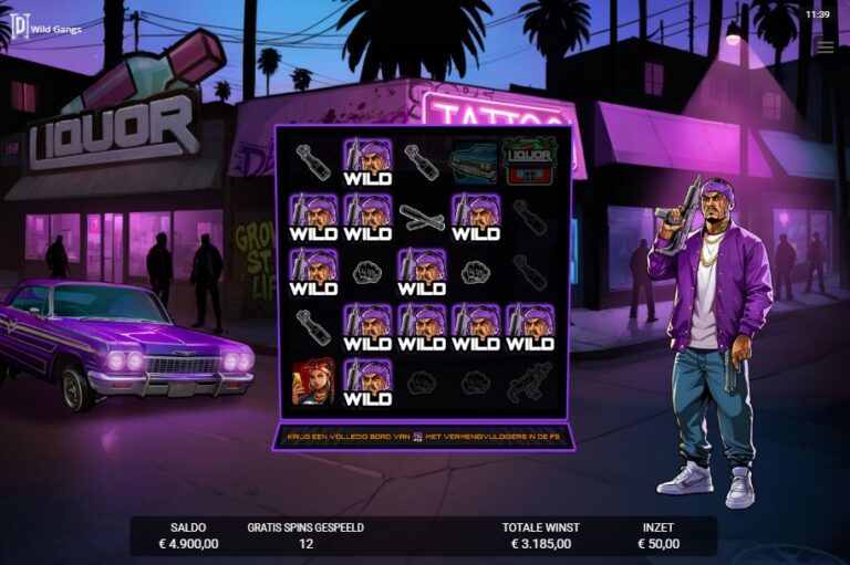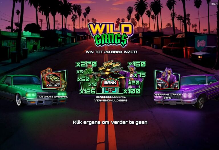 Reis terug naar de met palmbomen omzoomde straten van een stad die verdacht veel lijkt op Los Santos in Wild Gangs, een nieuwe en actievolle gokkast van Degen Studios. Dit spel is een onmiskenbare en briljante hommage aan de legendarische videogame Grand Theft Auto: San Andreas, compleet met een bikkelharde ‘turf war’ tussen een groene en een paarse bende. De gameplay is net zo explosief als het thema. Alles draait om de constante strijd tussen de twee verschillende ‘gang-wilds’. Hun interactie op de rollen leidt tot vuurgevechten en overvallen in de basisgame, en de uiteindelijke confrontatie bepaalt welke van de twee compleet verschillende bonusrondes je speelt. Met een indrukwekkende maximale winst van 20.000x de inzet is dit een bendeoorlog waar je graag middenin belandt.