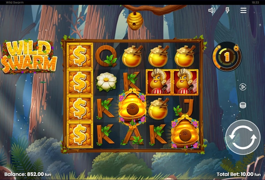 Het spel speelt zich af op een 5×4 raster met 20 vaste winlijnen. De variantie is medium-hoog, wat zorgt voor een prettige balans in de gameplay. De RTP tikt in het beste geval de 97,03% aan, wat uitzonderlijk hoog is voor een moderne videoslot. De hoofdrol is weggelegd voor de kleine bijtjes die willekeurig op het scherm landen. Elke keer dat je een bijtje draait, vliegt deze in de korf rechtsboven en laat een Wild Honey symbool achter op de rollen. Dit mechanisme zorgt ervoor dat je constant bouwt aan iets groters, een element dat we in een iets andere vorm ook terugzien in Wild Swarm 2, het vervolg dat de lat nog iets hoger legt.