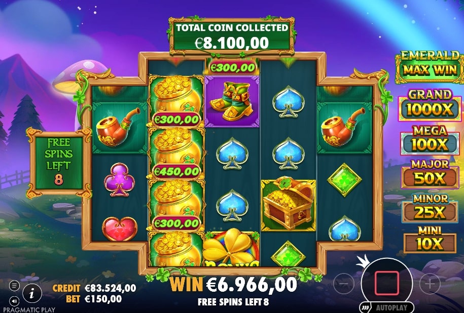 Een van de eerste veranderingen die opvalt, is het speelveld. Het spel wordt gespeeld op een ongebruikelijk 3-4-4-4-3 raster met 576 manieren om te winnen. De basisgame draait volledig om de ‘Money Collect’-feature. Wild-symbolen kunnen alleen op de rollen 1 en 5 landen. Wanneer ze verschijnen, fungeren ze als ‘collector’ en verzamelen ze de waarde van alle ‘Money’-symbolen (potten met goud) op het scherm. Nieuw in dit deel is de enorme potentie van deze symbolen. Naast standaard geldwaarden kunnen ze een van de zeven vaste jackpots onthullen, met de ‘Emerald Prize’ als absolute hoofdprijs van 10.000x. De standaard RTP is een hoge 96,5% (kan variëren) en de volatiliteit is medium.