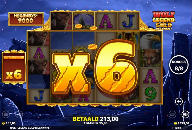 De ware jacht begint wanneer je 4 of meer huilende wolf-scatters landt, wat je 12 of meer gratis spins oplevert. Voordat de bonus begint, krijg je de kans om je spins te vergokken via de Gamble Feature op een prijzenwiel, in de hoop met meer spins te starten. De bonusronde zelf is de definitie van de klassieke Megaways-ervaring, een formule die we ook zien in iconische spellen als Gonzo’s Quest Megaways. Er is een progressieve winstmultiplier actief, die begint op x1 en met +1 stijgt na elke afzonderlijke cascade-winst. Cruciaal is dat deze multiplier niet reset tussen de spins en dus alleen maar kan groeien. De combinatie van een hoog aantal spins, veel cascades en een steeds hoger wordende multiplier is de sleutel tot de legendarische winsten.